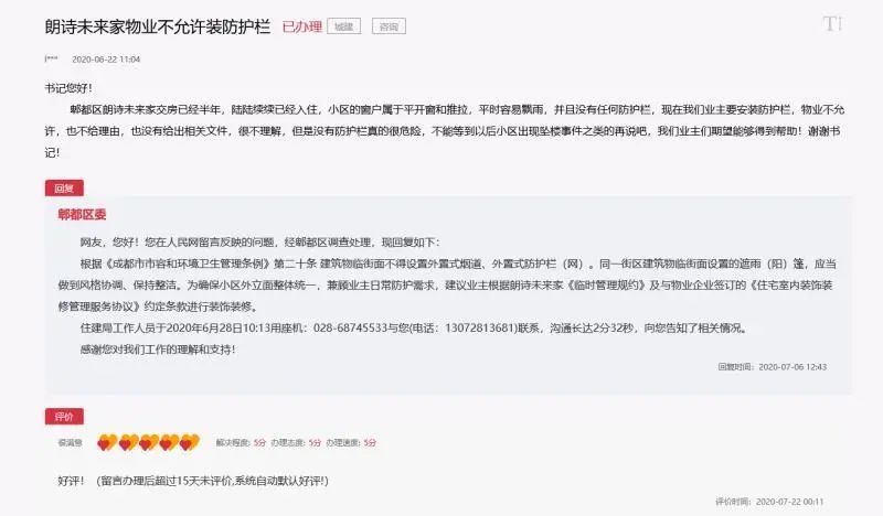▲郫都区对朗诗未来家物业不允许装防护栏的回复
