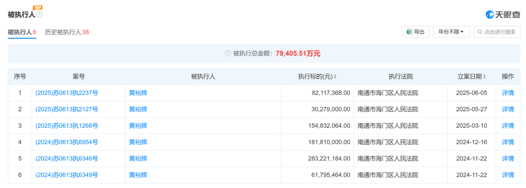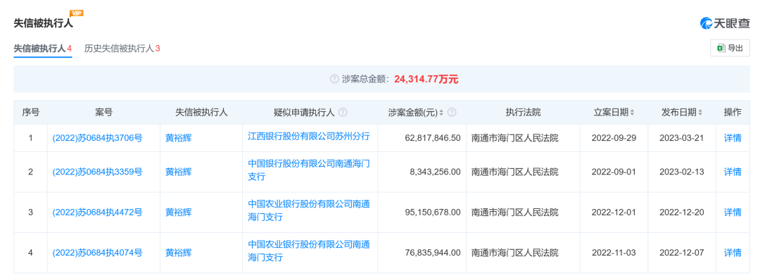天眼查显示,黄裕辉共存在4条失信被执行人信息,均由南通市海门区人民法院执行,涉案总金额约2.4亿元。