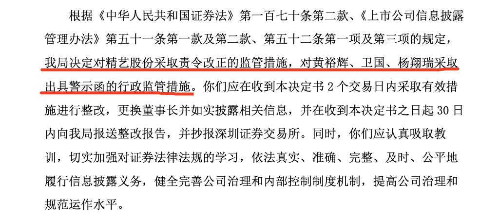 基于上述违规事实,广东证监局决定对精艺股份采取责令改正的监管措施,对黄裕辉、卫国、杨翔瑞采取出具警示函的行政监管措施。