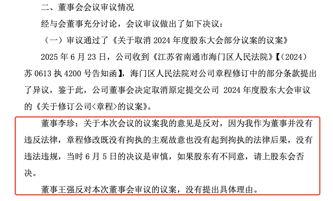 董事李珍的反对理由为“章程修改既没有拘执的主观故意也没有起到拘执的法律后果,没有违法违规,当时6月5日的决议是审慎,如果股东有不同意,请上股东会否决 ”,董事王强则没有提出具体理由。