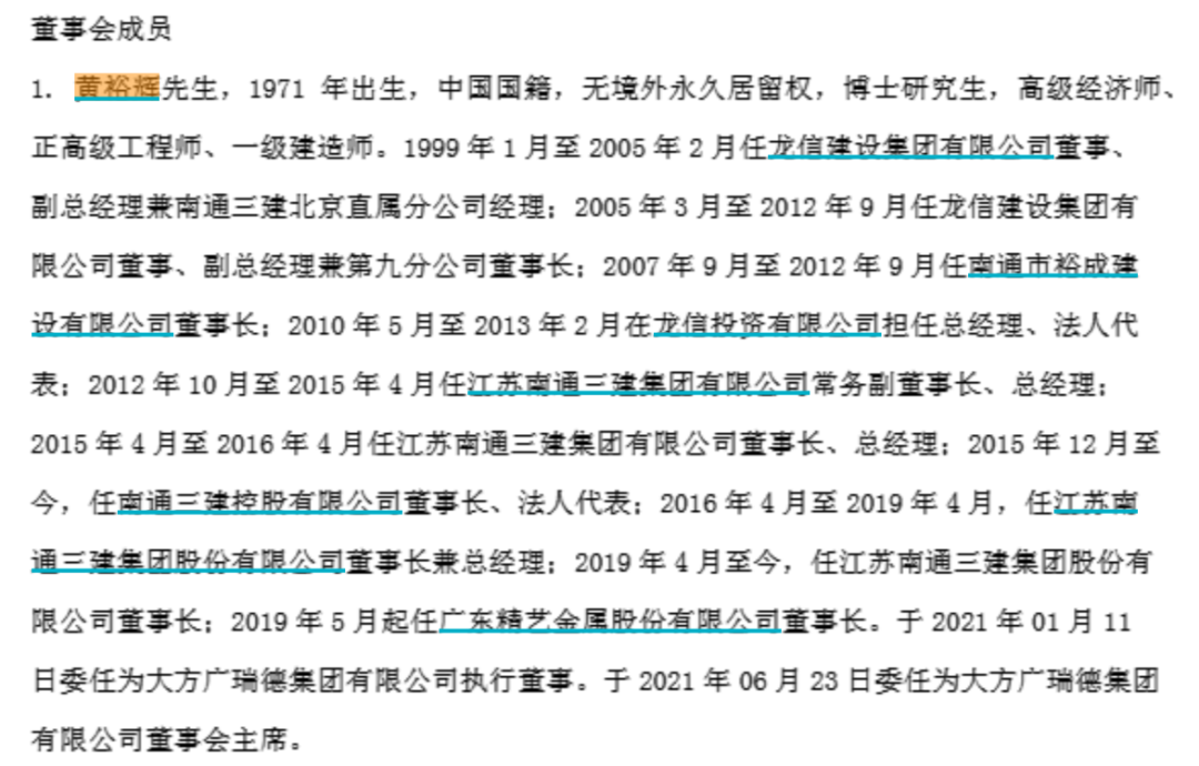 精艺股份年报显示,黄裕辉不仅担任公司董事长2019年4月至今担任公司董事长,他还曾担任过江苏南通三建集团有限公司总经理、董事长、南通三建控股有限公司董事长兼总经理等职务。