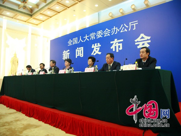 今天的新闻发布会是新通过的4部法律的专题新闻发布会。我们很荣幸地邀请到6位嘉宾来回答大家关心的与这4部法律相关的问题。他们是:全国人大常委会法制工作委员会副主任信春鹰女士;人力资源和社会保障部副部长胡晓义先生;民政部副部长姜力女士;全国人大常委会法制工作委员会立法规划室主任吴高盛先生;全国人大常委会法制工作委员会国家法室主任许安标先生;全国人大常委会法制工作委员会民法室副主任贾东明先生。