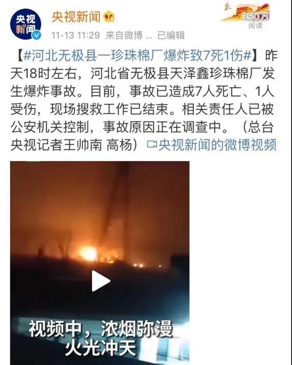 2016年9月晚,广东省珠海市斗门白蕉开发区一包装厂珍珠棉仓库突发大火,并伴有爆燃声。经过消防部门1个多小时的扑救,大火被扑灭。大火造成约1000平方米的仓库被烧垮,未造成人员伤亡。起火原因是堆放的珍珠棉在发生脱落过程中产生静电从而引起自燃。