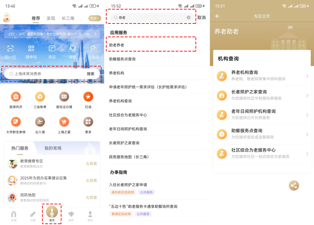 登录“随申办市民云”APP→首页搜索框中输入关键字“助老养老”→点击“助老养老”进入服务专区;