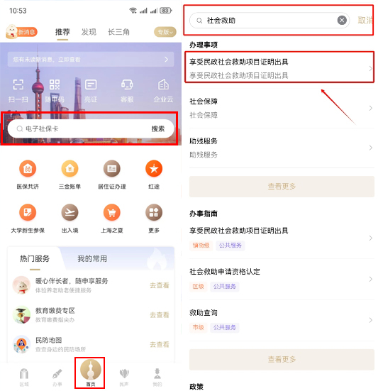 登录“随申办市民云”APP→首页搜索关键词“社会救助”,选择“享受民政社会救助项目证明出具”。
