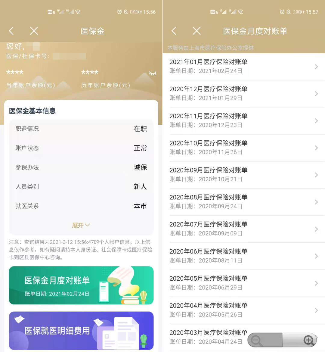 点击“医保金”的“查看详情”后,即可查看医保账户状态、当年医保账户余额、历年账户余额、医保金月度对账单、医保就医明细费用等信息。