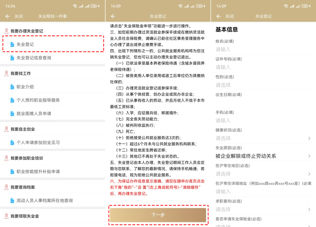 点击“失业登记”→阅读《承诺和告知》后,点击“下一步”→填写基本信息并提交申请。收到申请成功提示后,即表示已成功办理失业登记。