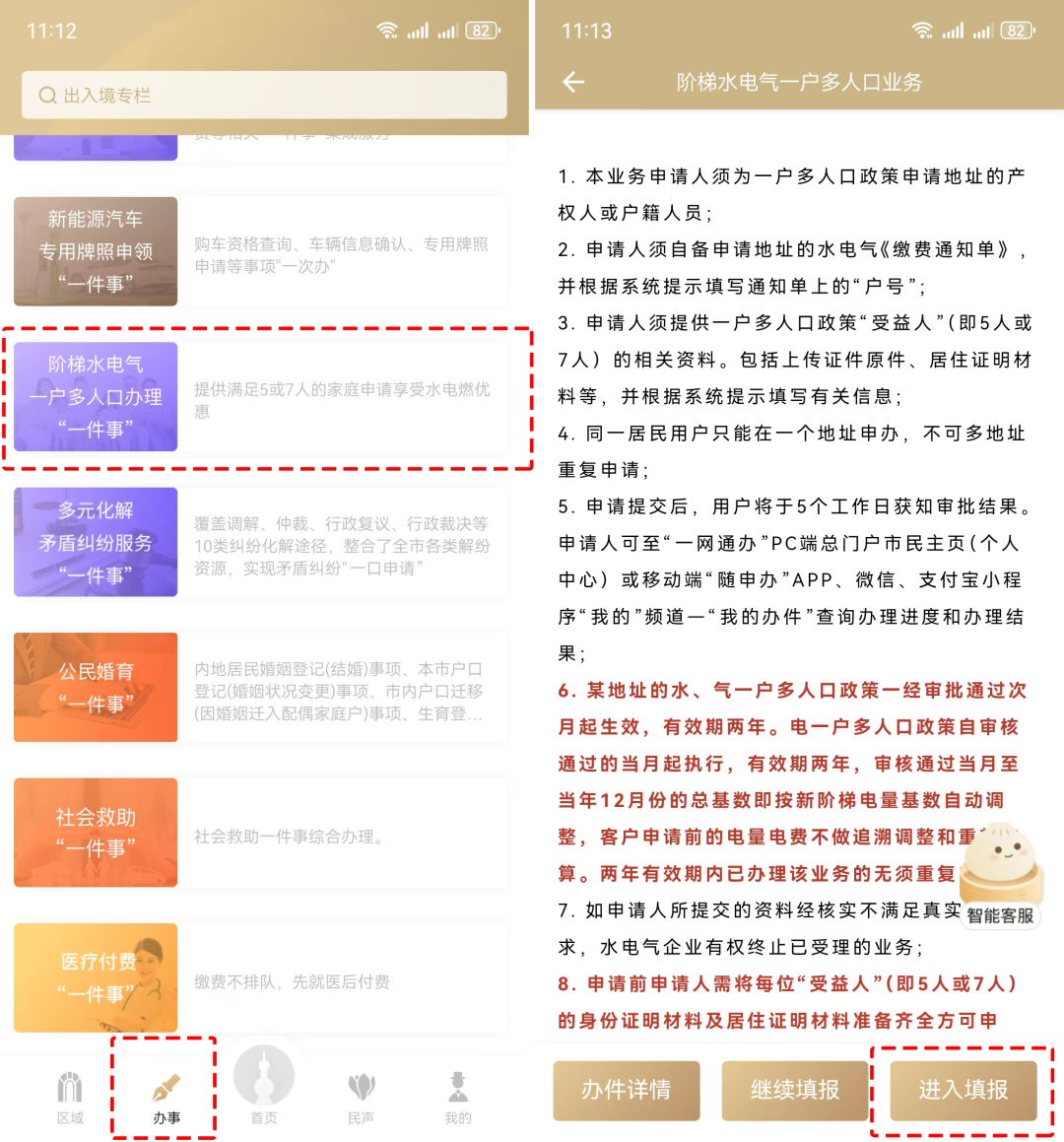 登录“随申办市民云”APP的“办事”频道→点击“阶梯水电气一户多人口办理”进入服务页面;