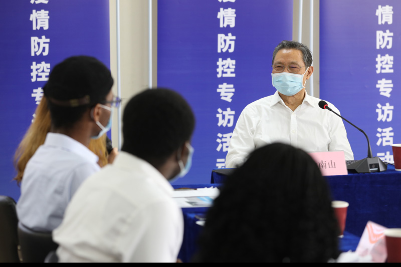 在广州市第78场疫情防控新闻采访活动上,中国工程院院士钟南山与在穗工作学习的外籍人士代表进行座谈交流(2020年4月15日摄)。新华社记者 李嘉乐 摄