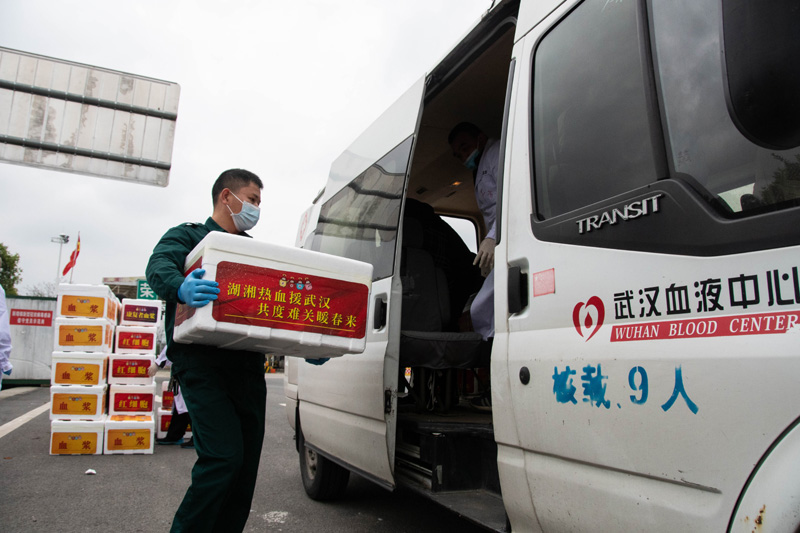 在湖南岳阳荣家湾收费站出口,湖南省血液中心工作人员把支援湖北省的临床用血搬运到湖北血液中心的车辆上(2020年3月30日摄)。新华社记者 陈思汗 摄