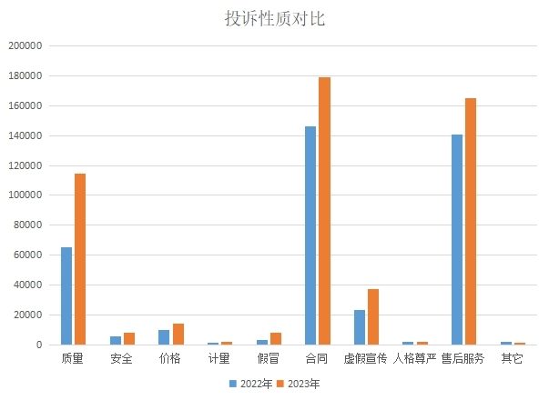 随着我省法治环境不断优化,消费者合同法治意识进一步提高,2023年合同类投诉178815件,占投诉总量33.63%,连续三年居投诉性质类别首位。该类投诉集中分布在互联网服务、生活社会服务和家用电子电器等消费领域,投诉主要问题是:网络游戏经营者单方面更改游戏条款,限制游戏账号使用;餐饮住宿、美容美发行业设置不公平退款条件、高额违约金;移动电话机、计算机激活后问题产品退货退款条件严苛等。从性质来看,投诉数量前三的还有售后服务(164989件)和质量(114641件),分别占总量31.03%和21.56%。其中,质量投诉增量49258件,为增量最大的类别,主要集中在服装鞋帽、日用商品和家用电子电器等领域。另外,假冒问题投诉8163件,同比增长约1.4倍,增速最快,主要分布在家用电子电器产品和日用商品领域。