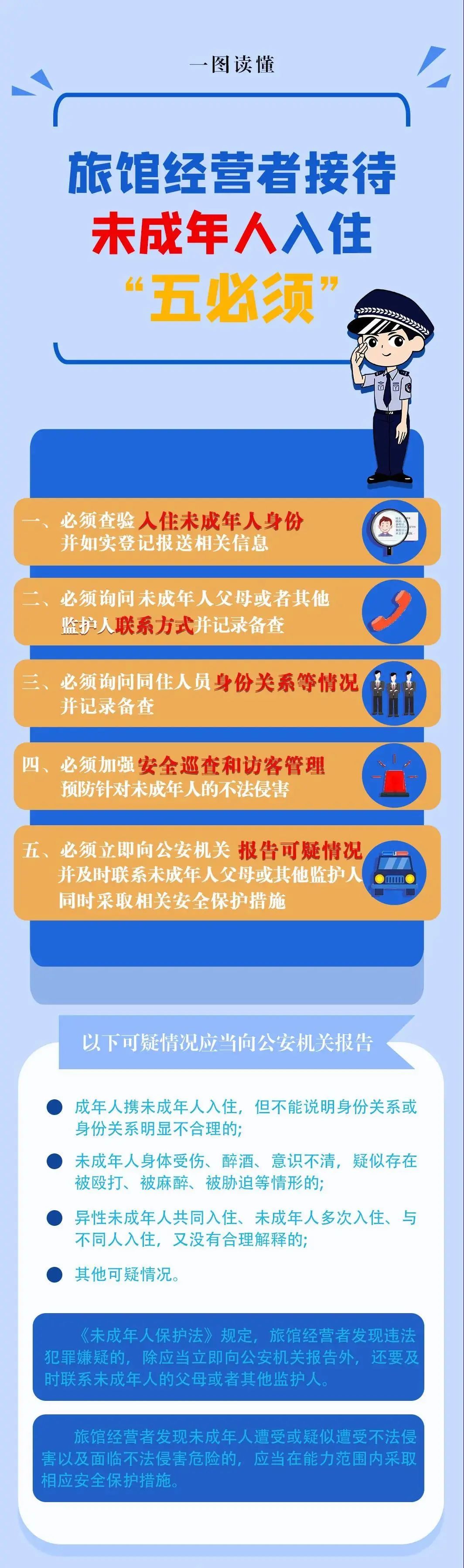 根据《未成年人保护法》《治安管理处罚法》《旅馆业治安管理办法》等法律法规,公安部对旅馆经营者接待未成年人入住提出“五必须”要求,切实防范在旅馆中侵害未成年人案件的发生,保护未成年人身心健康。