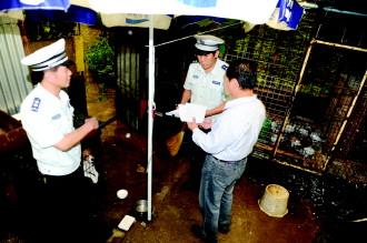 机场执法人员向养鸽居民发放《净空通知书》。  资料图片
