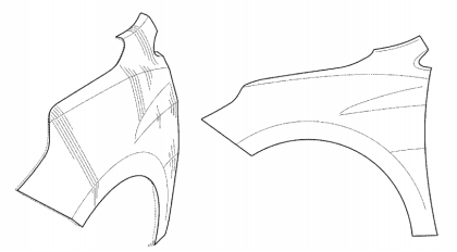 LKQ 公司是全球汽车回收行业的巨头企业,成立于1998年,由位于佛罗里达州、密歇根州、俄亥俄州和威斯康辛州的几家汽车零部件回收企业合并而成。其作为车身零部件销售商,获得了GM多项外观设计专利的许可。这些专利许可中包括涉案专利,该专利保护一种车辆的前挡泥板的外观,用于GM的2018-2020雪佛兰Equinox,其立体图与主视图如下图所示: