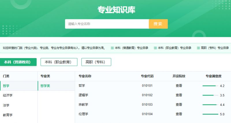 专业查询板块包括普通本科、职业教育本科和高职(专科)的专业库,其中,普通本科专业目录提供了详尽的专业介绍,包括专业简介、开设院校、开设课程、专业解读、毕业生规模统计、相近专业、考研方向、就业方向、薪酬指数等,是帮助考生了解专业的平台。