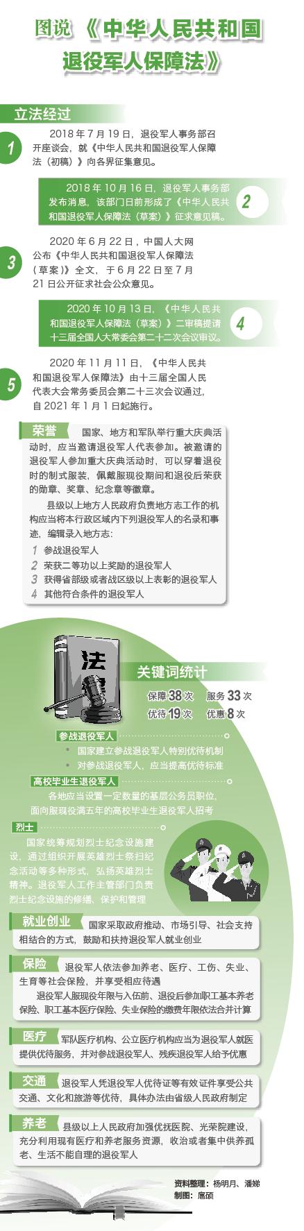 2020年11月11日,十三届全国人大常委会第二十三次会议,审议通过《中华人民共和国退役军人保障法》(以下简称退役军人保障法),国家主席习近平签署主席令予以公布,自2021年1月1日起施行。