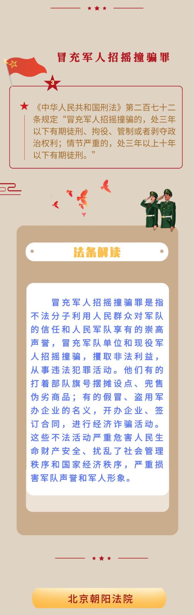冒充军人招摇撞骗的,处三年以下有期徒刑、拘役、管制或者剥夺政治权利;情节严重的,处三年以上十年以下有期徒刑。