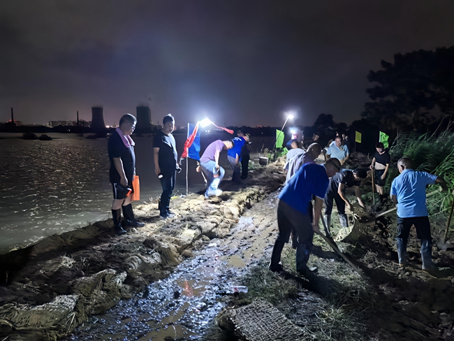 安徽省淮南市潘集区高皇镇镇村干部夜间设置沙袋进行加固大坝