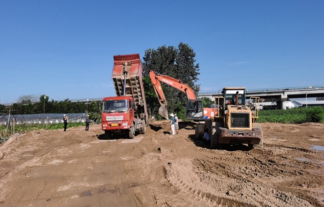 梅汛期7月4日湖北黄冈黄州处置管涌:填塘压渗铺盖施工中