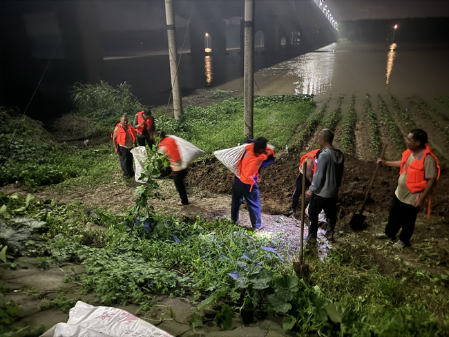 安徽省淮南市潘集区高皇镇群众夜间装设沙袋