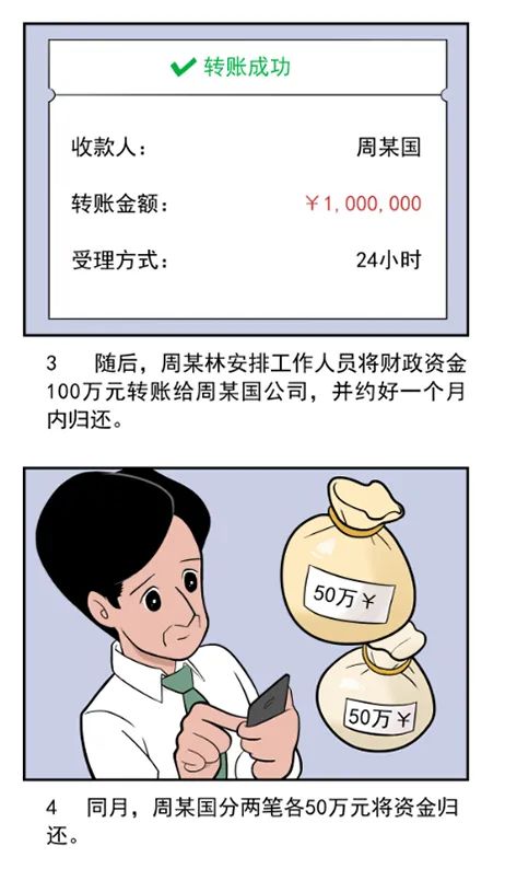 2015年5月8日,时任Y市某街道财政所所长周某林为帮助解决其兄长某公司法定代表人周某国经营周转困难,周某林向街道办事处主任口头请示后,以为企业垫交税款为名,安排工作人员将该街道办事处财政资金一百万元转账至其兄长公司账户,并约定一月内归还。同月15日、22日,周某国通过公司账户和其个人账户分两笔各五十万元将资金归还。