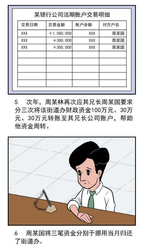 2016年7月、8月、9月,周某林应其兄长要求,分三次将该街道办事处财政资金100万元、30万元、30万元转账至其兄长公司账户,用于其兄长公司经营周转,三笔挪用资金均分别于挪用当月由周某国所在企业归还街道。