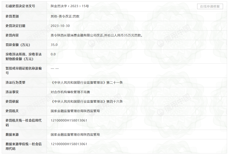 2023年10月,陕西长银消金因对合作催收机构管理不完善,被责令改正并处以35万罚款。