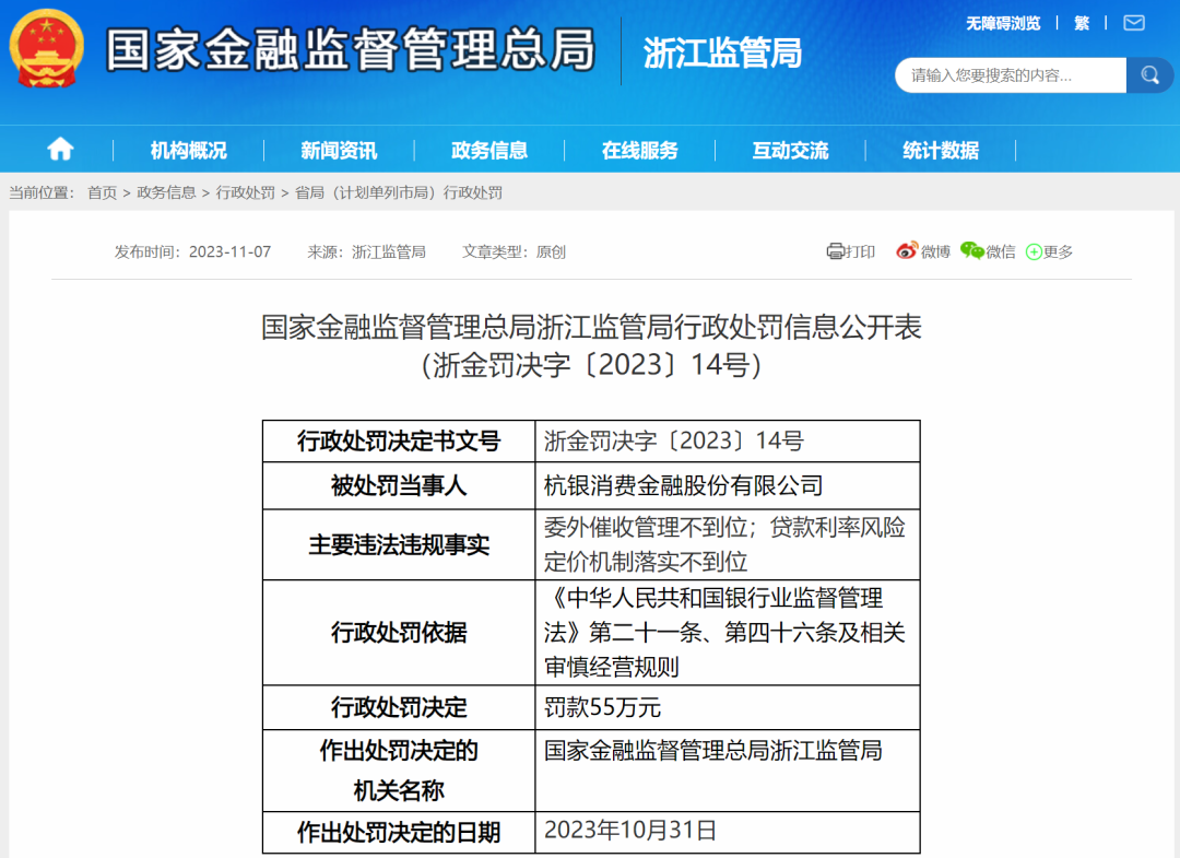 2023年11月,杭银消金因委外催收不到位等被浙江监管局罚款55万元。