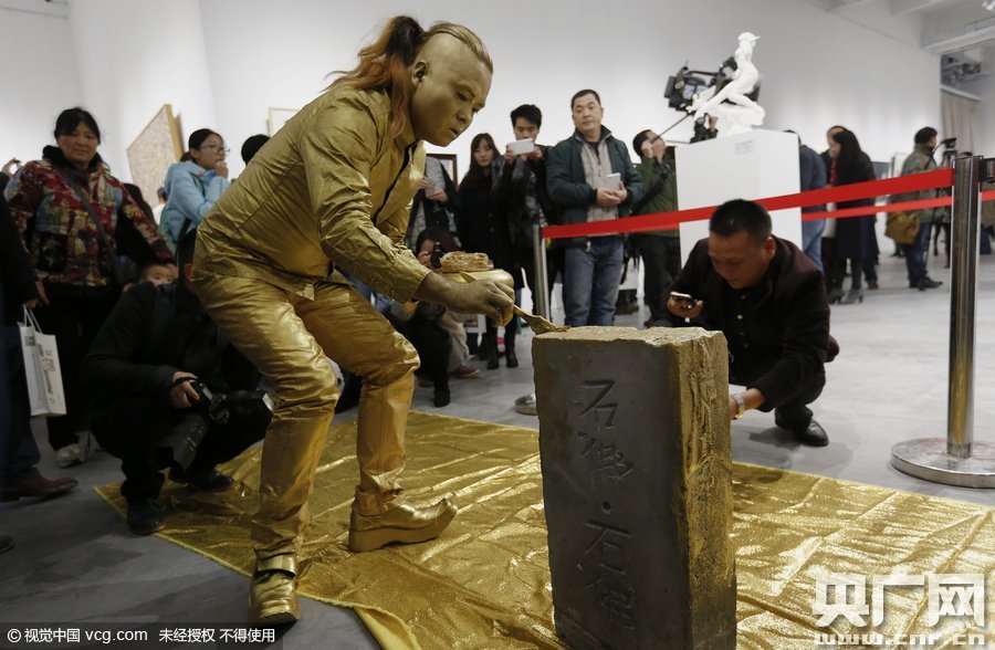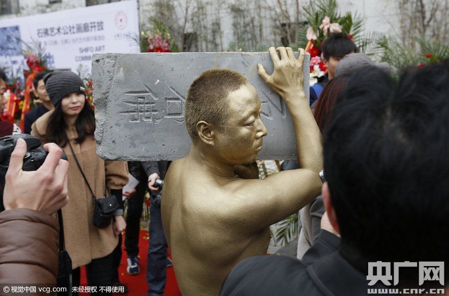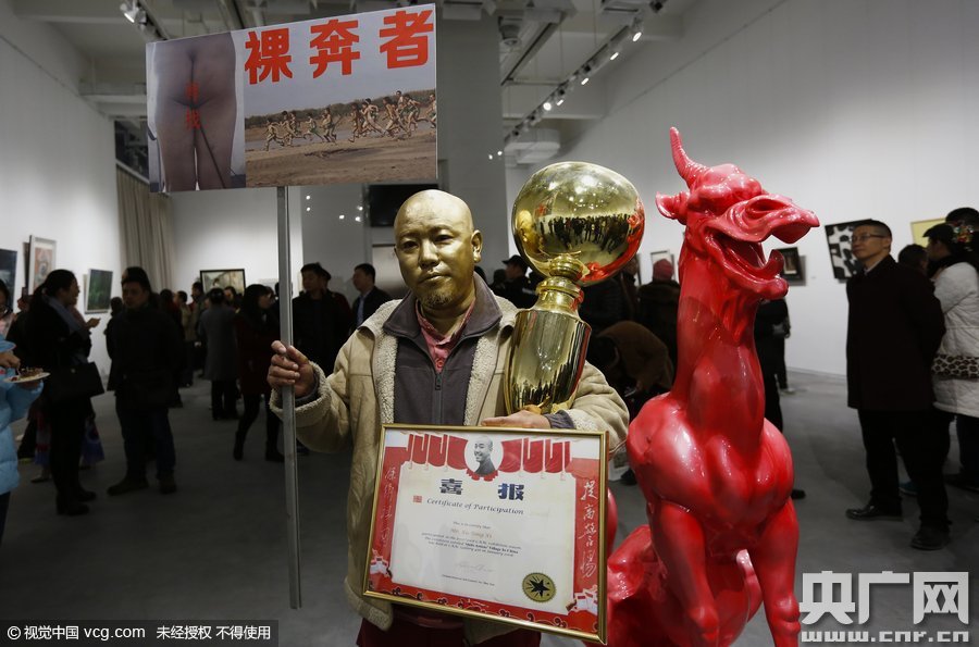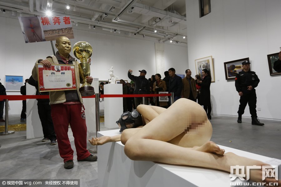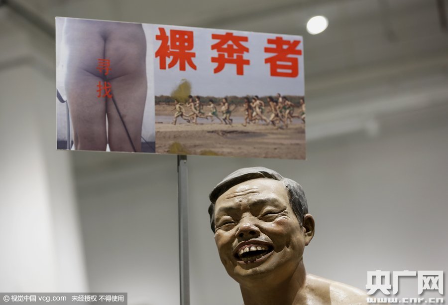2015年11月17日,河南省郑州市,《石佛.石佛》当代艺术展开展。 徐同喜的“裸奔者”行为艺术与曹?作品:《MASK》相结合引起关注。“人体”为假人,由综合材料做成。