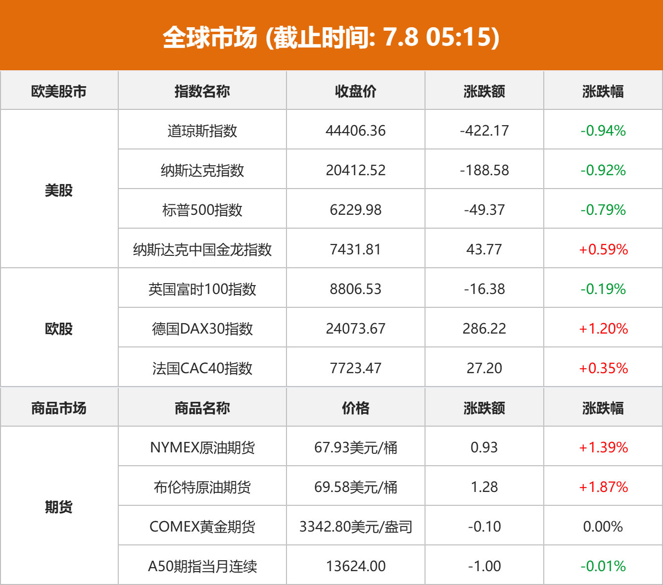 摘要:特朗普宣布对14国加征关税,关税截止日期延长至8月1日,美股日韩概念股下挫;美国提议对欧盟加征10%的关税,附带限制性条款。