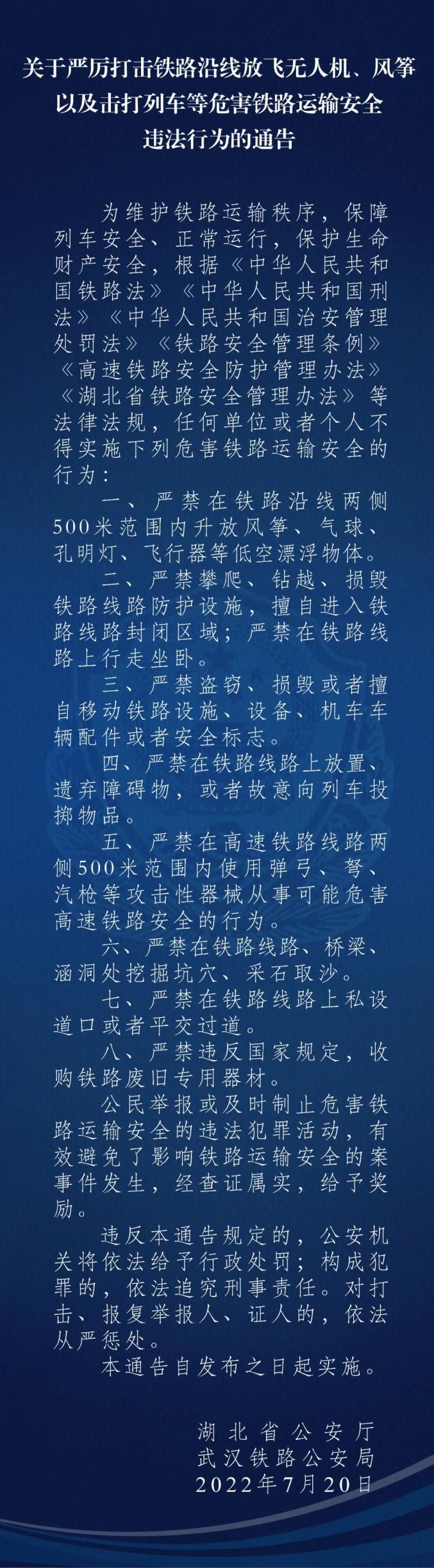 原标题:《关于严厉打击铁路沿线放飞无人机、风筝以及击打列车等危害铁路运输安全违法行为的通告》