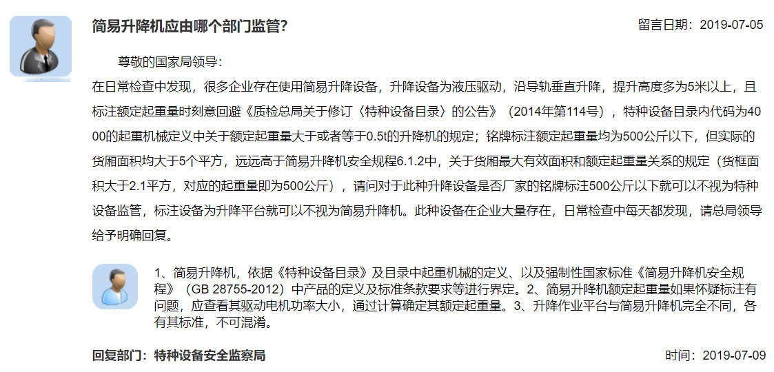 有网友于7月5日在国家市场监督管理总局网站公众留言系统咨询简易升降机监管的有关问题,7月9日,市场监管总局特种设备安全监察局给予了答复。