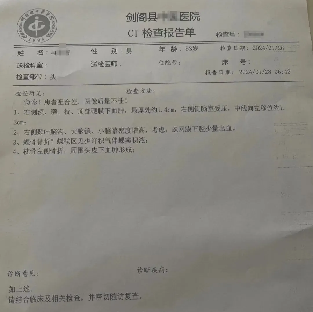 冉先生女儿称,到医院后,医生说颅内出血一直增加,大约过了十几分钟就宣布没有自主呼吸 ,瞳孔完全扩散,脑死亡。“医生宣判脑死亡,失去抢救机会和意义,人在ICU,医生说等待家属通知拔出呼吸、血压这些设施,就会出死亡证明。”
