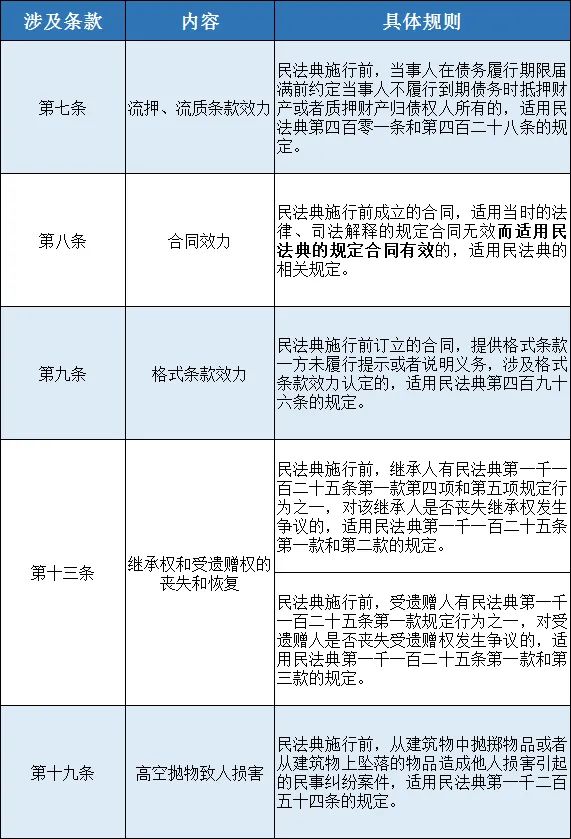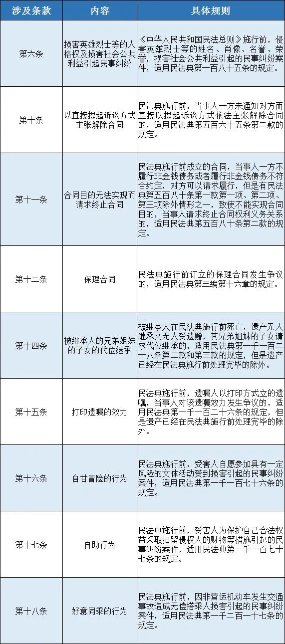 《司法解释》规定的空白溯及条款与《九民纪要》规定的“法官不得拒绝裁判规则”同源,体现了保证裁判标准统一的内容,主要指:之前法律、司法解释未规定的部分情形可以适用民法典的规定。《司法解释》同时也明确了适用空白溯及原则的三种例外情形为:明显减损当事人合法权益、增加当事人法定义务或背离当事人合理预期的。
