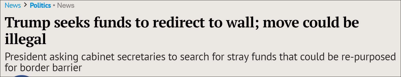第二,特朗普政府在去年十一月中期选举以后,就动员内阁成员逐条查阅各部门预算,把能通过合法渠道转换用途的资金向他汇报。这一举动当时民主党浑然不觉。因为民主党人都乐观地认为,所有拨款必须国会通过,只要国会能拖住特朗普,他的墙就是没有希望的。