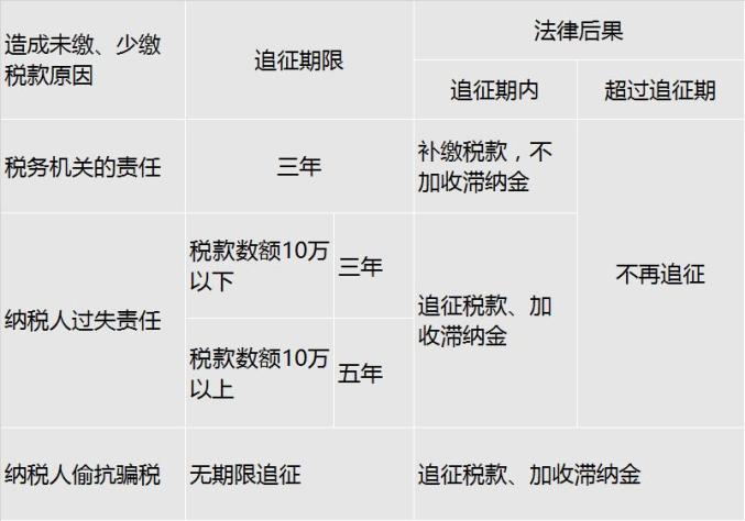 我国现行税法尚没有区分核定时效和征收时效,仅在《税收征收管理法》第五十二条及《税收征收管理法实施细则》相关条款中,根据导致税款未予征缴的原因分三种情况,即税务机关的责任,纳税人或扣缴义务人的失误,纳税人或扣缴义务人偷税、抗税、骗税行为等,规定不同的追征期限和不同的法律后果,具体图示如下:
