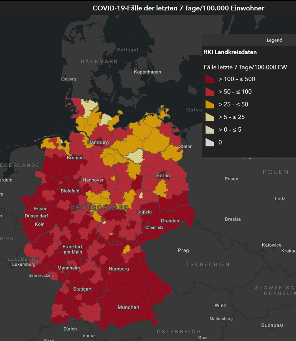 德国传染病防治权威医疗研究机构,罗伯特·科赫研究所(RKI)实时更新发布的德国各行政区7日平均每十万居民感染人数,是地方政府制定和量裁自己管辖区域内防疫措施的依据。其中,区域该指数越高,则在图中显示颜色越深。该图也显示了德国内部各个行政区疫情发展的差异,是州政府用来否定全国性措施的主要论据。图片获得于2020年11月19日,来源:https://experience.arcgis.com/experience/478220a4c454480e823b17327b2bf1d4