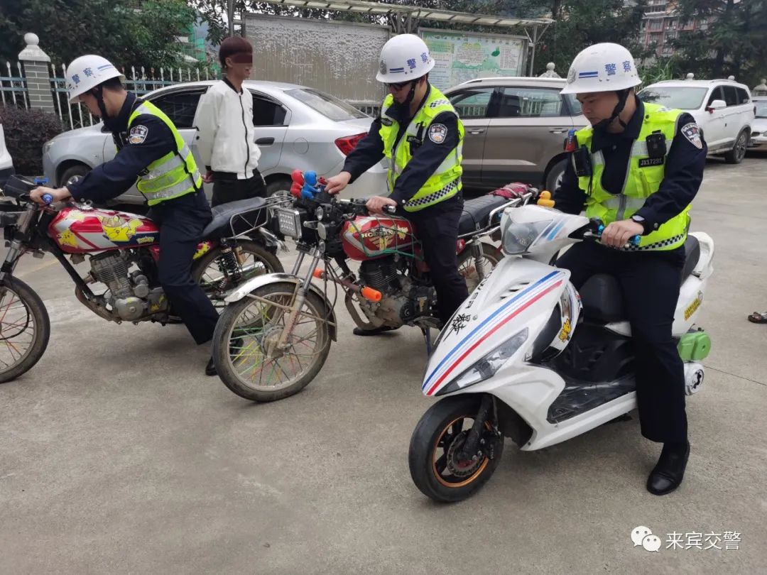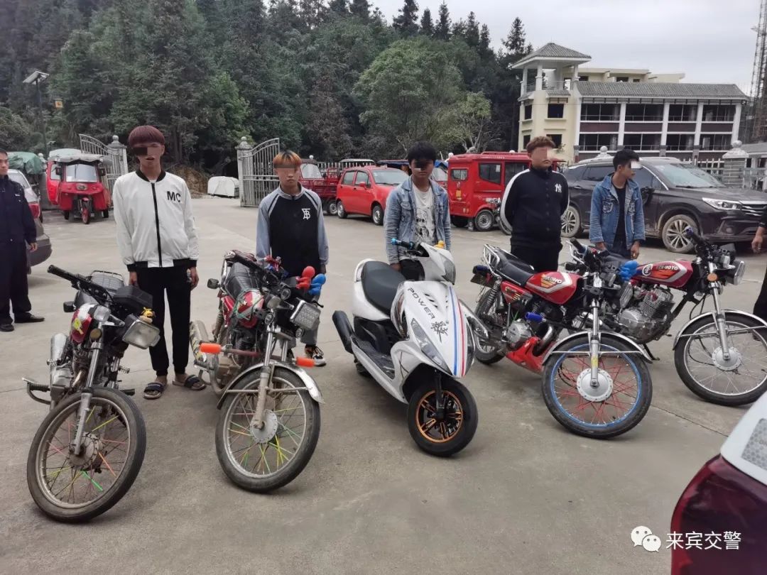 金秀中队民警接到群众的举报后立即行动,经过巡逻排查、搜索,于下午16时40分许找到了被举报车辆。在金秀民乐路路口100米处,民警看到5辆车并排停放着,车上放着书包,车旁或站或坐着几名青年,在一边抽烟一边聊天。