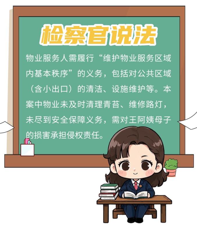 一天清晨,王阿姨推着婴儿车经过小区侧门出口,因地面青苔湿滑不慎摔倒,婴儿车翻倒致孩子轻微擦伤。经查看,该出口处长期无人清扫,路灯也因线路老化损坏多日。王阿姨找物业理论,却被以“出口非主要通道,责任自负”为由拒绝赔偿。