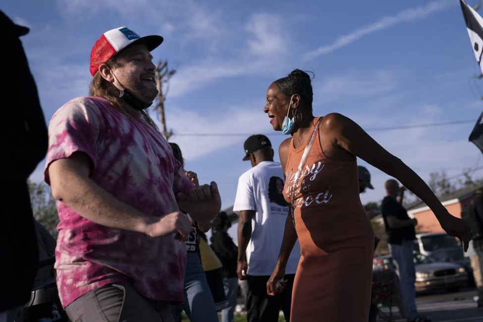 △4月20日,民众在洛杉矶市佛罗伦萨大道和诺曼底大道交汇处的十字路口跳舞。此前,明尼阿波利斯前警官德雷克·肖万因涉嫌于2020年杀害乔治·弗洛伊德被判有罪。(图片来源:美联社)