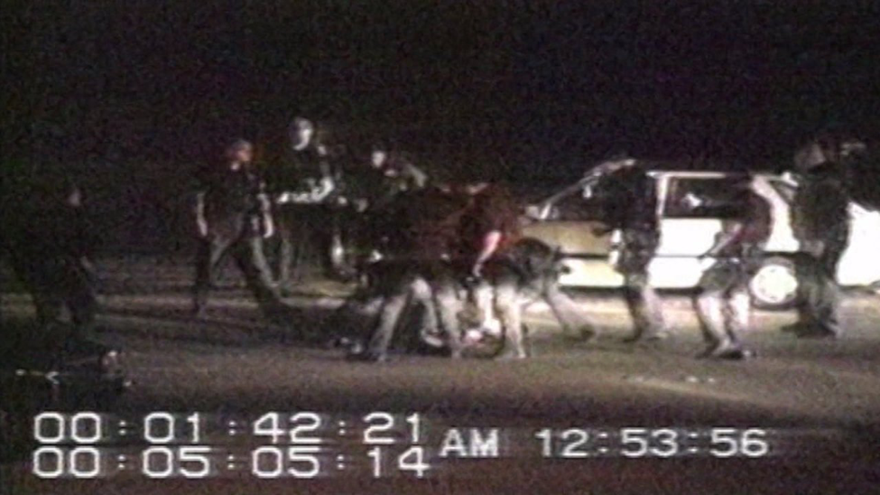 辛格跳下警车,喝令无路可逃的三人下车。金的两名非洲裔同伴吓得魂不附体,按规矩将双手放在背后。但金借着酒劲儿却不想束手就擒,故意拖延,甚至对慢慢靠近的辛格做出一些挑衅动作。一名警察孔恩制止了辛格,转而命令鲍威尔等4名白人刑警去制服金。金的体格强悍,4名警察未能制服金。