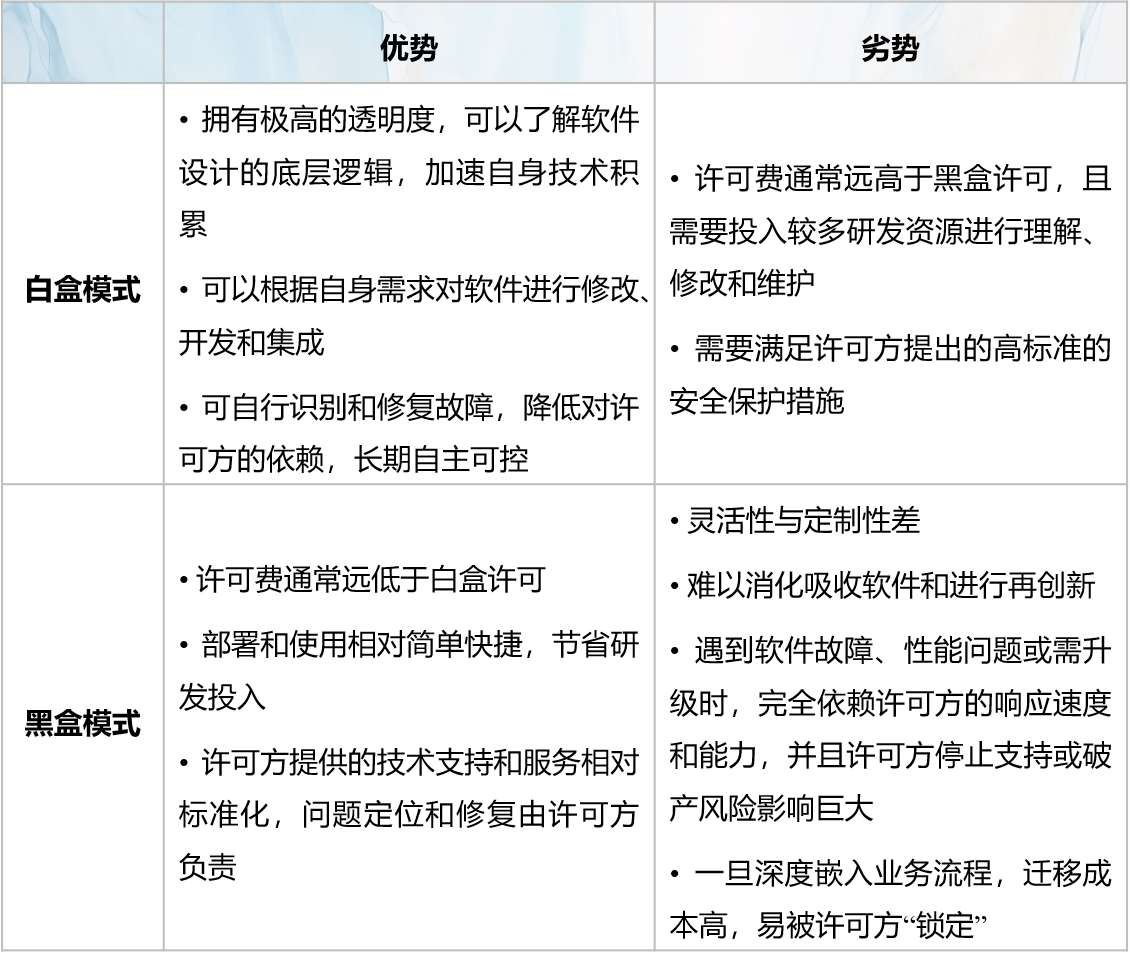 ·白盒模式:许可方向被许可方提供软件的完整源代码(或关键模块源代码),并通常附有详细的设计文档、注释等。该模式一般适用于对技术自主可控要求较高的领域,以及技术引进后需要消化吸收再创新的项目。