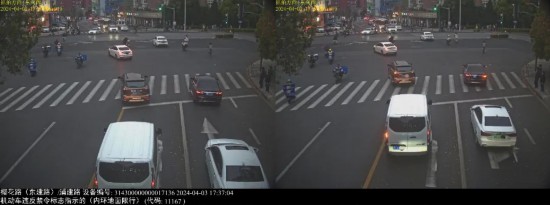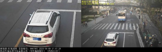 ▲2024年4月9日17時47分,號牌為黑GV1***的小型普通客車在浦建路櫻花路,實施了“機動車違反禁令標志指示的(內環地面限行)”違法行為。