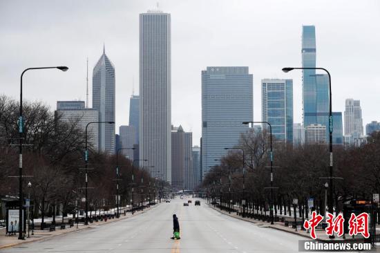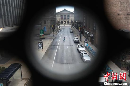 当地时间3月20日美国伊利诺伊州州长普里茨克也宣布了“居家令”,要求本州1200多万民众尽量居家。这一行政令将于21日生效,持续至4月7日。据此,仍在营业的所有“非必要”企业都将关闭。学校、公园、图书馆关闭。食品店、医院、加油站等必要设施开放。图为当地时间3月23日在美国伊利诺伊州,一名男子走过芝加哥艺术学院附近一条几乎空无一人的亚当斯街。
