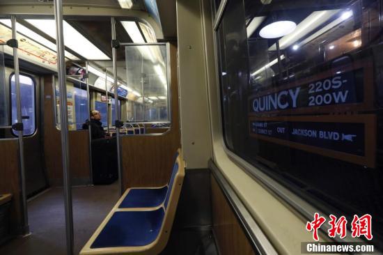 当地时间3月23日在美国伊利诺伊州,一名男子在昆西车站乘坐芝加哥交通管理局(Chicago Transit Authority)的一列几乎空无一人的“L”型列车。
