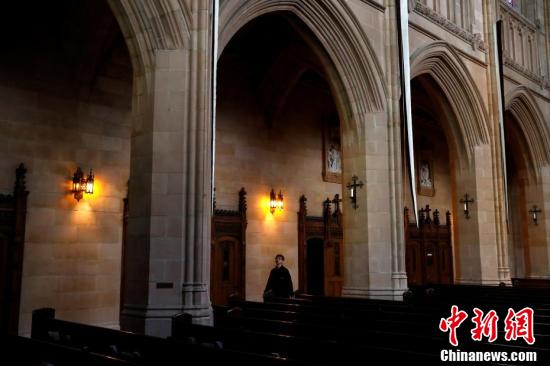 当地时间3月23日,在美国加利福尼亚州旧金山,一名游客走在空荡荡的圣多米尼克天主教教堂内。