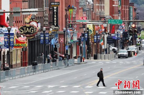 当地时间3月22日,美国田纳西州首府纳什维尔市长约翰·库珀宣布为期14天的“居家令”,要求民众留在家中,以减少新冠病毒传播。库珀要求所有非必需服务的商业设施关闭,餐厅只能送外卖,并且禁止10人以上的聚集。图为当地时间3月23日,在美国田纳西州纳什维尔,一个男人走过冷清的百老汇大街。