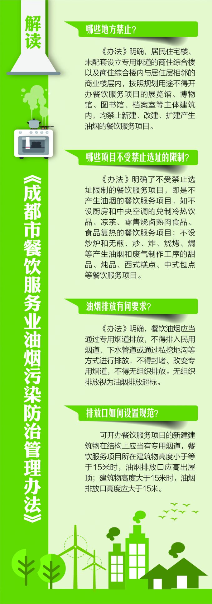 目前,《成都市餐饮服务业油烟污染防治管理办法》(以下简称《办法》)已正式施行。《办法》中明确,居民住宅楼、未配套设立专用烟道的商住综合楼以及商住综合楼内与居住层相邻的商业楼层内,不得新建、改建、扩建产生油烟的餐饮服务项目。这一办法明确了哪些油烟污染防治责任?哪些餐饮服务项目可以不受禁止选址的限制?禁止选址的清单怎么起作用?……市城管委政策法规和行政执法处负责人对大家关心的问题作出解读。
