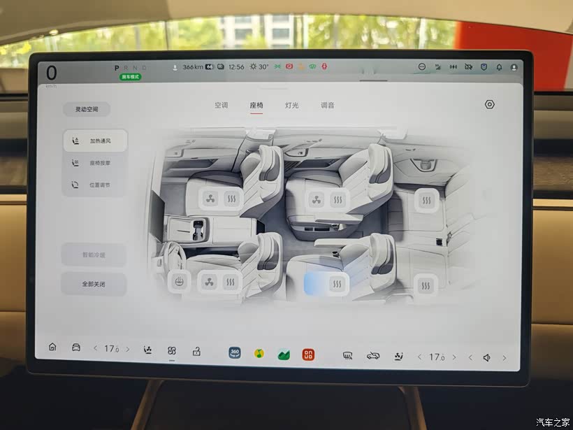全车6个座椅都带加热功能,只有三排不带座椅通风。