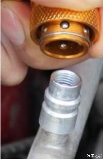 6、拧开标有“L”字样的低压管防尘盖,就能看到像气门芯一样的装置,然后把加注工具的接头端按上。